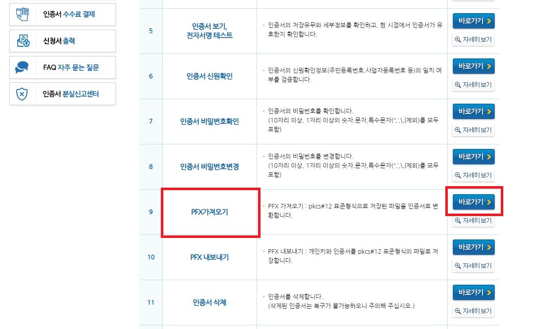 화면 중간쯤 내려와 9번 PFX 가져오기에서 바로가기를 클릭해 줍니다.