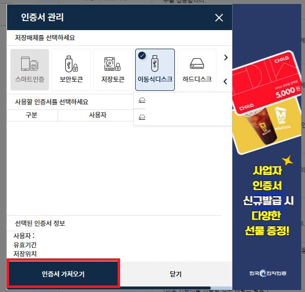 바로가기 클릭 후 저장하시고자 하는 장소 - 이동식디스크(usb, 하드 등), 하드디스크(컴퓨터 내), 휴대폰 선택 후 '인증서 가져오기'를 클릭해 줍니다. 인증서 가져오기 클릭 후 인증서를 저장해둔 폴더를 찾아 인증서를 클릭해 주시면 인증서 가져오기를 완료하였다는 메세지가 뜹니다.