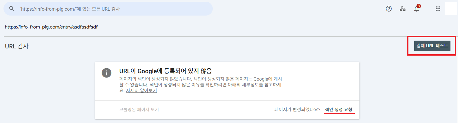 보통 많은 분들이 바로 ‘색인 생성 요청’을 눌러 색인을 시도하시는데요, 저 역시 처음엔 그렇게 진행했다가 색인 생성에 실패한 적이 여러 번 있었습니다. 이후에는 반드시 오른쪽의 ‘실제 URL 테스트’를 먼저 진행한 후, 색인 생성 요청을 하도록 바꾸었고, 그 결과 실패율을 크게 줄일 수 있었습니다.