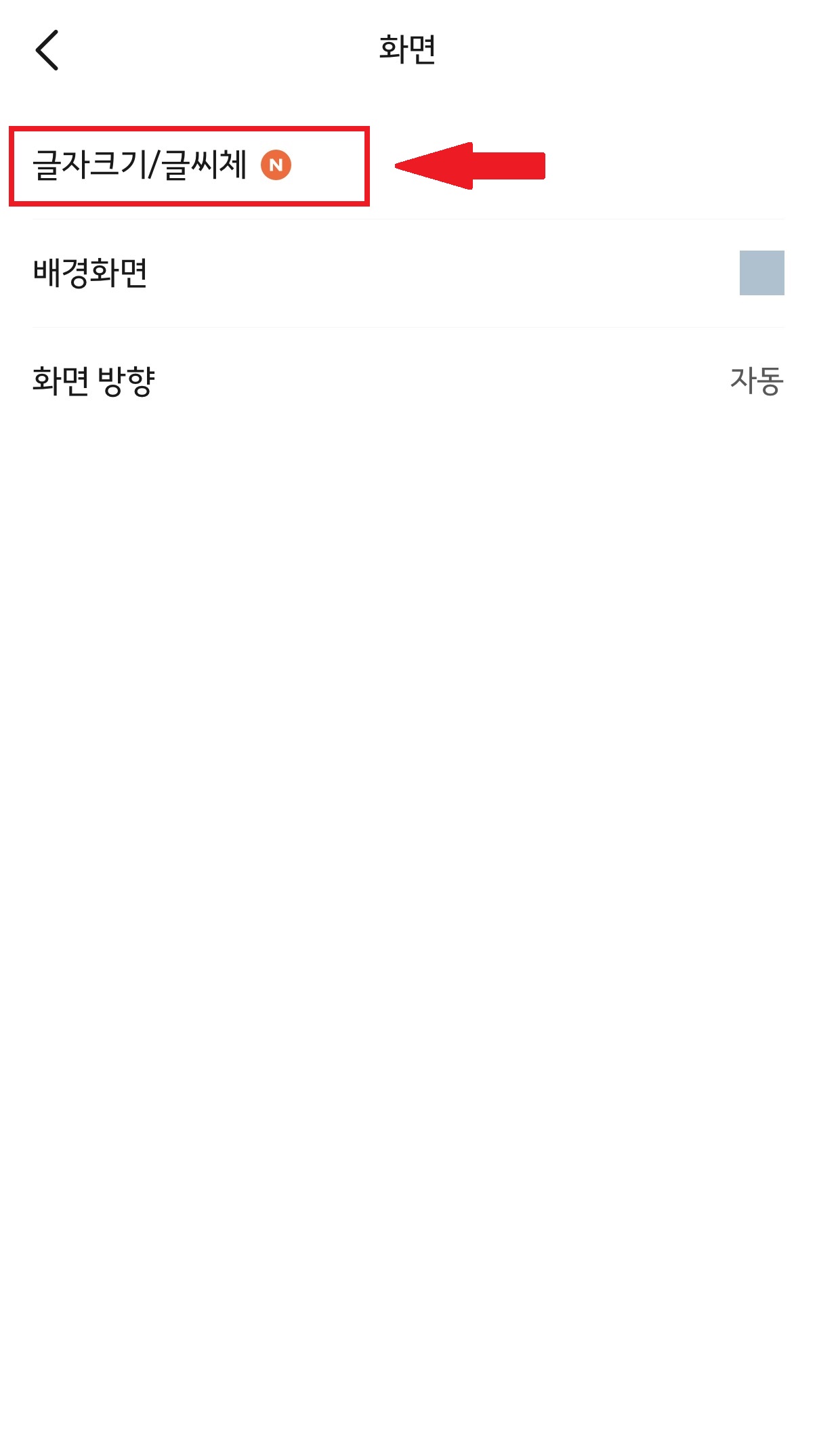 - 화면 메뉴 선택: 메뉴 리스트 중간쯤에 있는 [화면] 메뉴로 들어갑니다.
