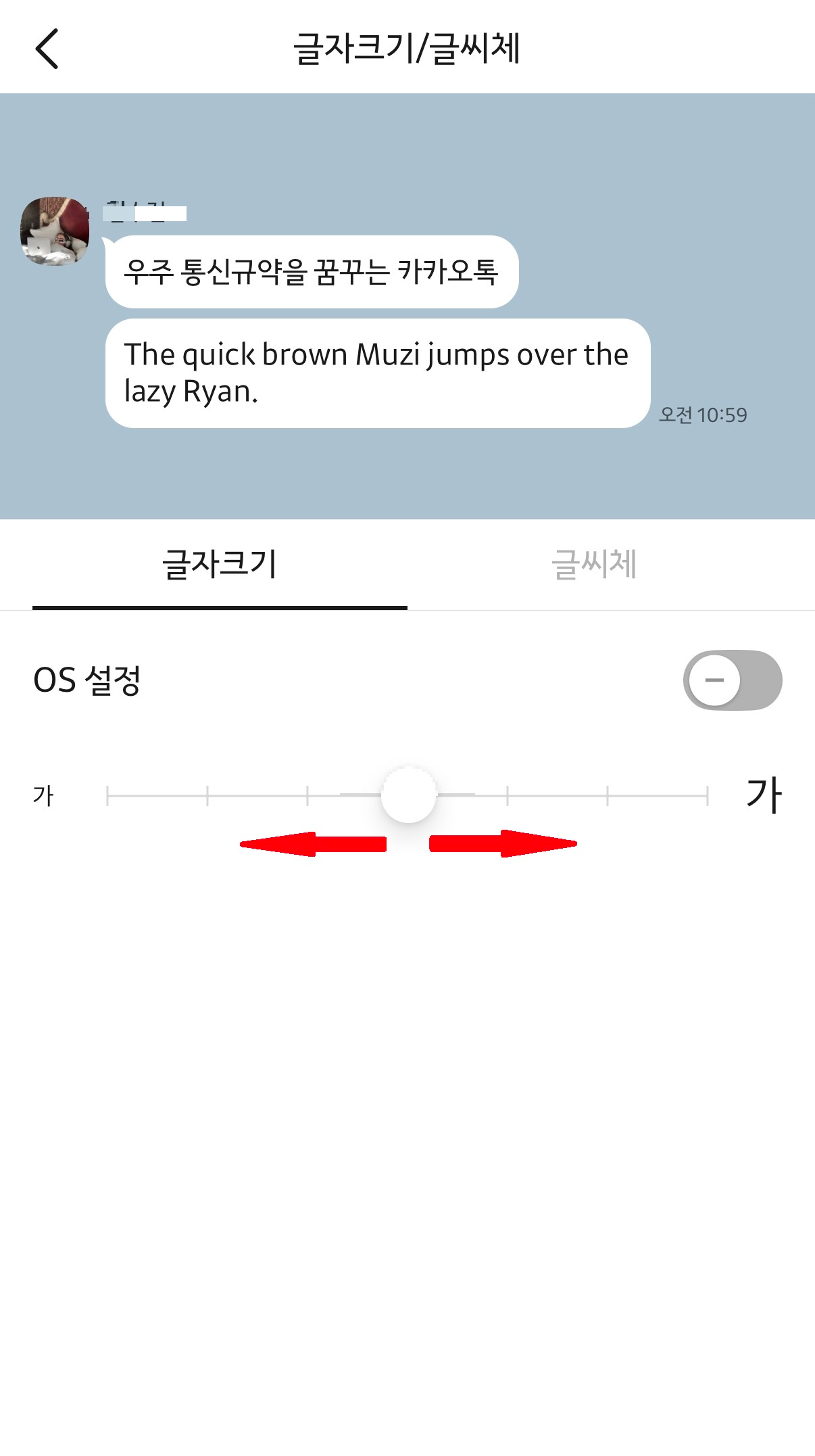 - [글자 크기] 조절 바를 오른쪽으로 밀어 크기를 키웁니다.