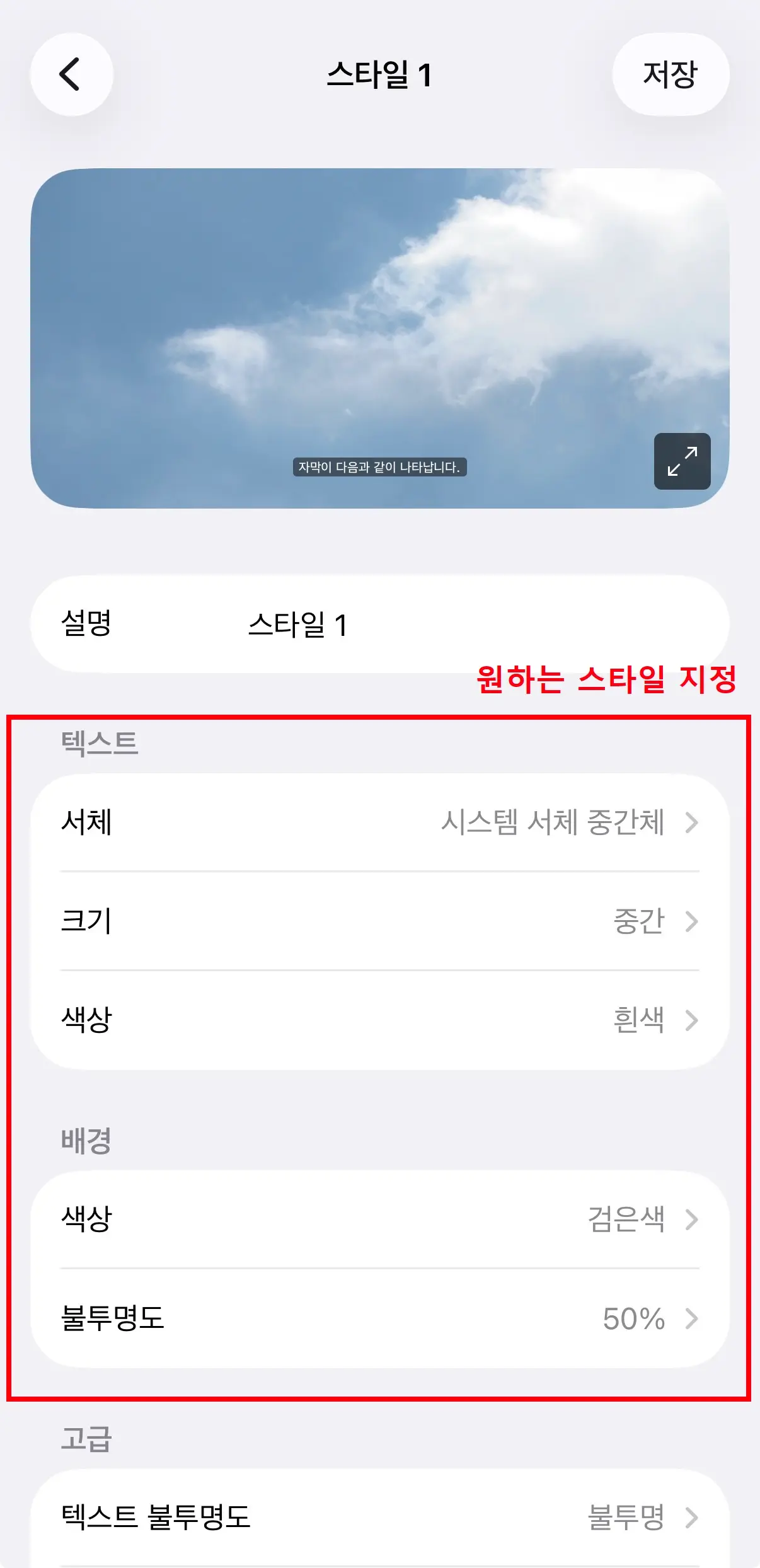 - 자막 스타일: 흰색 자막이 잘 안 보인다면 [노란색 자막]이나 [검은색 배경에 흰색 글자]를 선택해 보세요. 글자와 배경의 대비가 뚜렷해져서 눈이 훨씬 편해집니다.